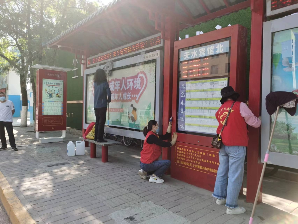 5月7日至9日,天水羲通公交旅游集团志愿者服务队队员走上街头,对秦州、麦积两区的公交站亭进行了集中清洗,队员们清除张贴在公交站亭的小广告,重点打扫了公交站亭不易清洗的盲点以及卫生死角。经过清洗,公交站亭设施焕然一新,给乘客提供了一个干净整洁的公交出行环境,为助力创城贡献了一份“公交”力量。新天水记者蔚军平 摄