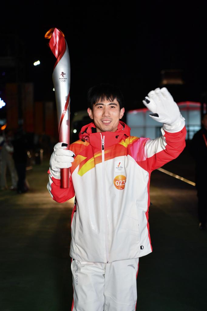 2022年2月2日,北京冬奥会火炬在首钢园传递,作为火炬手的史晓刚在火炬传递中。新华社记者李鑫摄