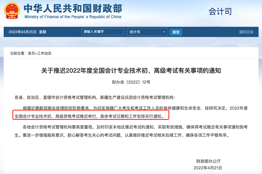 根据近期新冠肺炎疫情防控形势要求,为切实保障广大考生和考试工作人员的身体健康和生命安全,经研究决定,2022年度全国会计专业技术初、高级资格考试推迟举行,具体考试日期和工作安排另行通知。