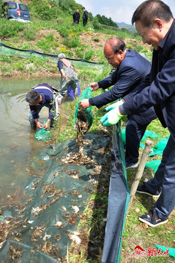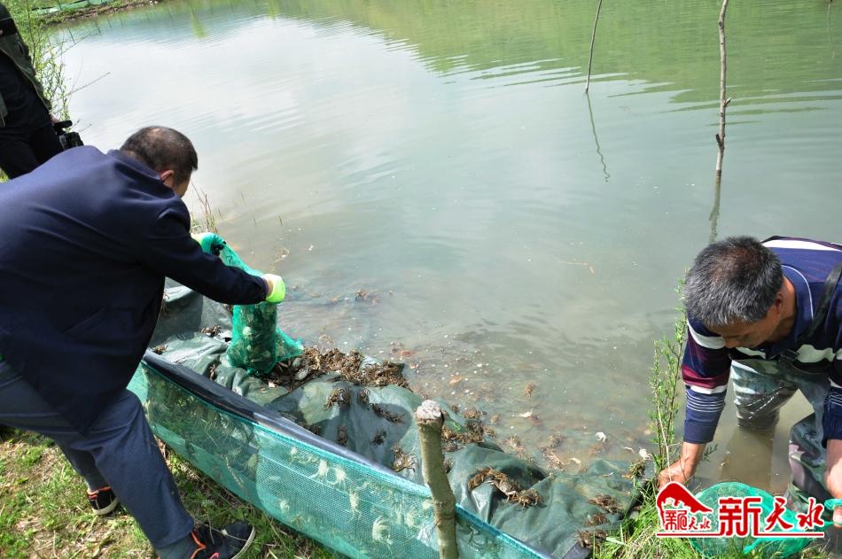5月9日,在位于秦州区皂郊镇马家河村的秦州区鑫颐隆冰滩种养殖农民专业合作社螃蟹养殖基地,市渔业工作站和秦州区渔业工作站的技术人员正在帮助养殖户投放螃蟹幼苗。当日,我市从连云港引进的第二批螃蟹幼苗抵达我市。