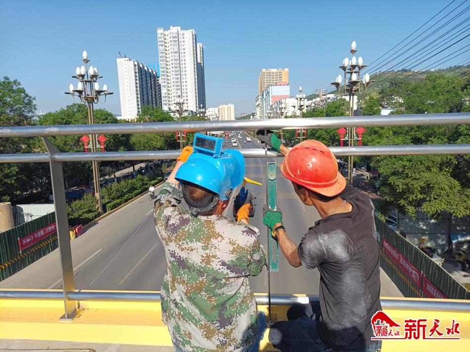连日来,在位于天水市四中西侧的天水郡十字人行便桥项目施工现场,施工人员正在加紧进行不锈钢玻璃栏杆的安装等作业。记者在现场看到,天桥已经完成了油漆涂装,桥面花岗岩火烧板已铺装完毕,路面透水砖也已完成铺装。