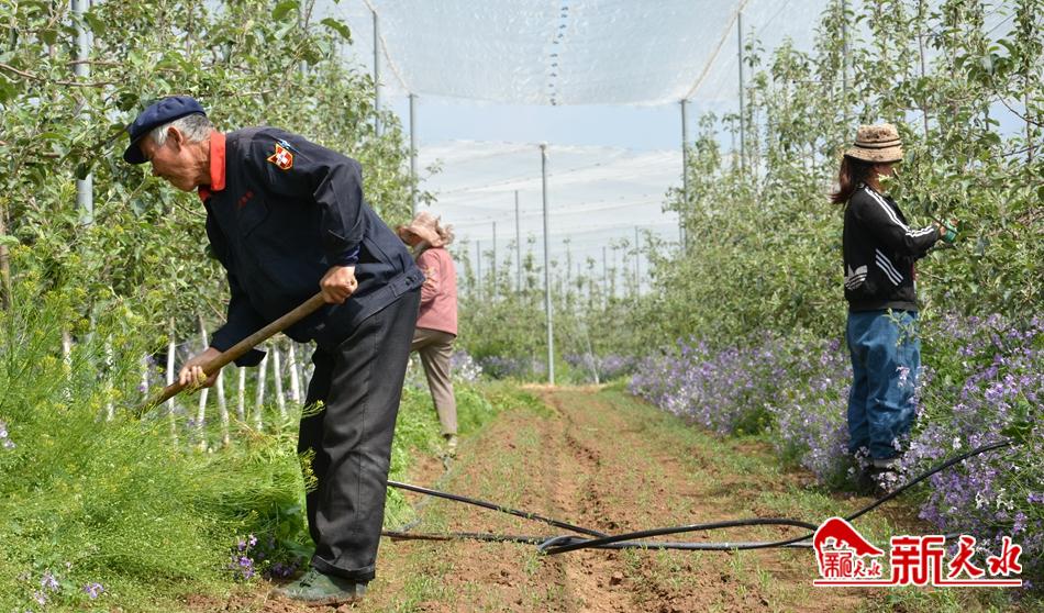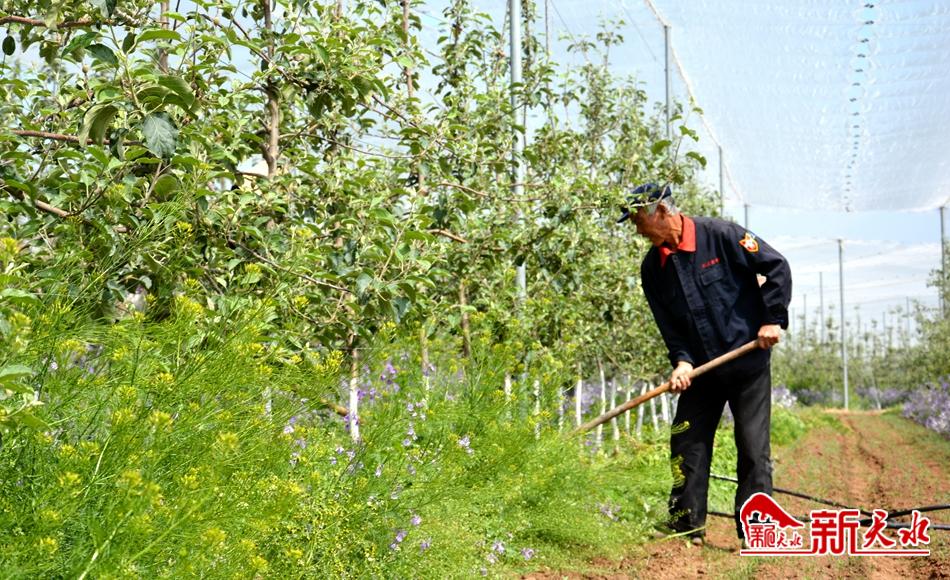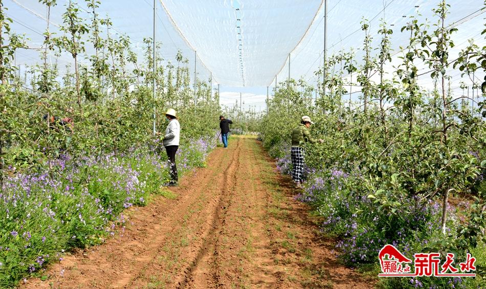 初夏时节,甘谷县磐安镇张家沟矮化密植苹果示范园的苹果树已落花坐果,树下一丛丛二月兰正值花期,紫白相间的小花和树上碧绿的叶片相映成趣,构成一道靓丽的果园美景。