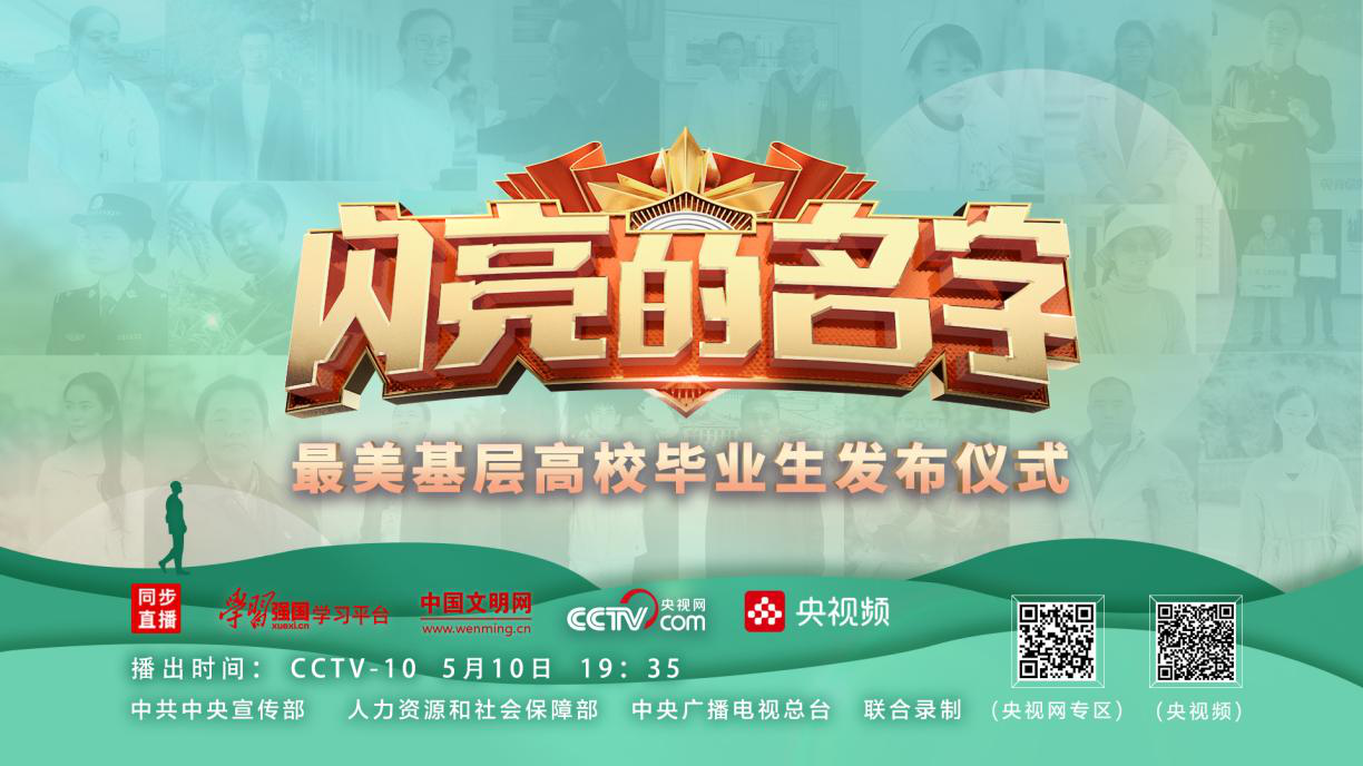 《闪亮的名字——最美基层高校毕业生发布仪式》将在中央广播电视总台央视科教频道(CCTV-10)5月10日19:35播出。节目播出期间,学习强国、中国文明网、央视网、央视频等新媒体平台同步直播。