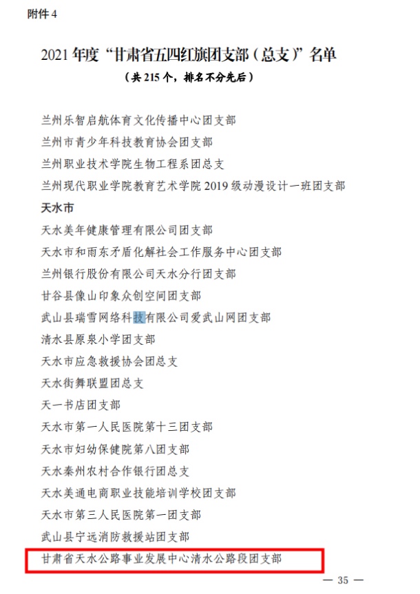 新天水讯【通讯员 冯文茜】五四前夕,甘肃省人力资源和社会保障厅、共青团甘肃省委作出表彰决定,清水公路段团支部荣获2021年度“甘肃省五四红旗团支部”荣誉称号。