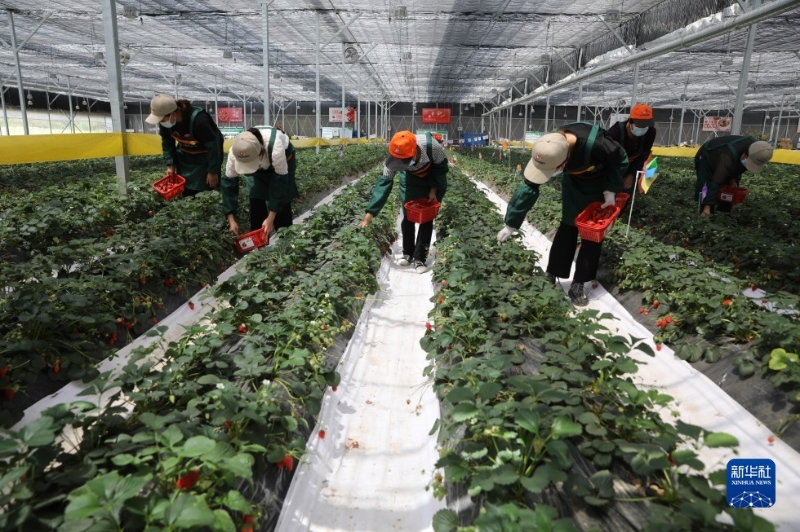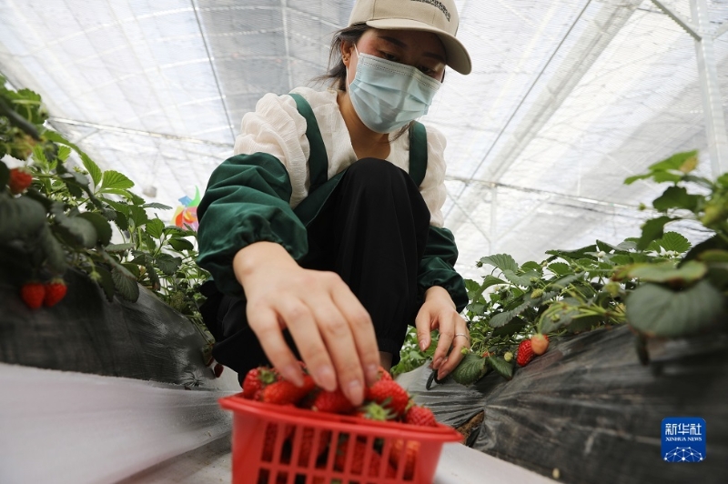 5月11日,在天水市秦州区一家农业公司的大棚内,村民在采摘草莓。新华社记者 杜哲宇 摄
