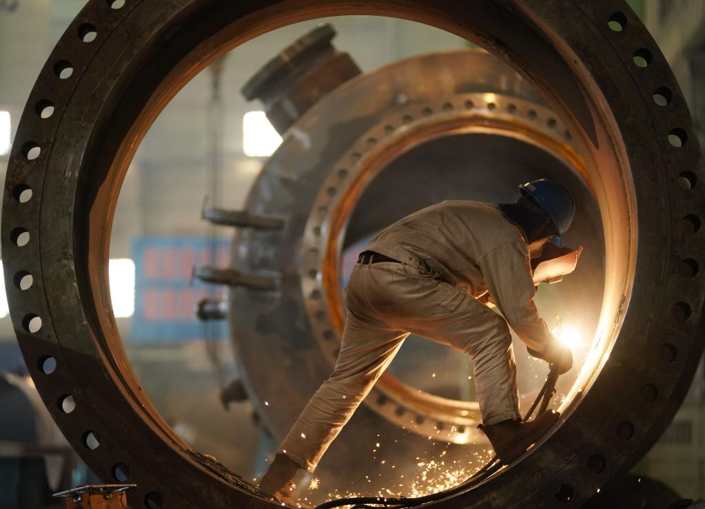 4月14日,在哈电集团哈尔滨锅炉厂有限责任公司车间,工人进行生产作业。(新华社记者王建威摄)