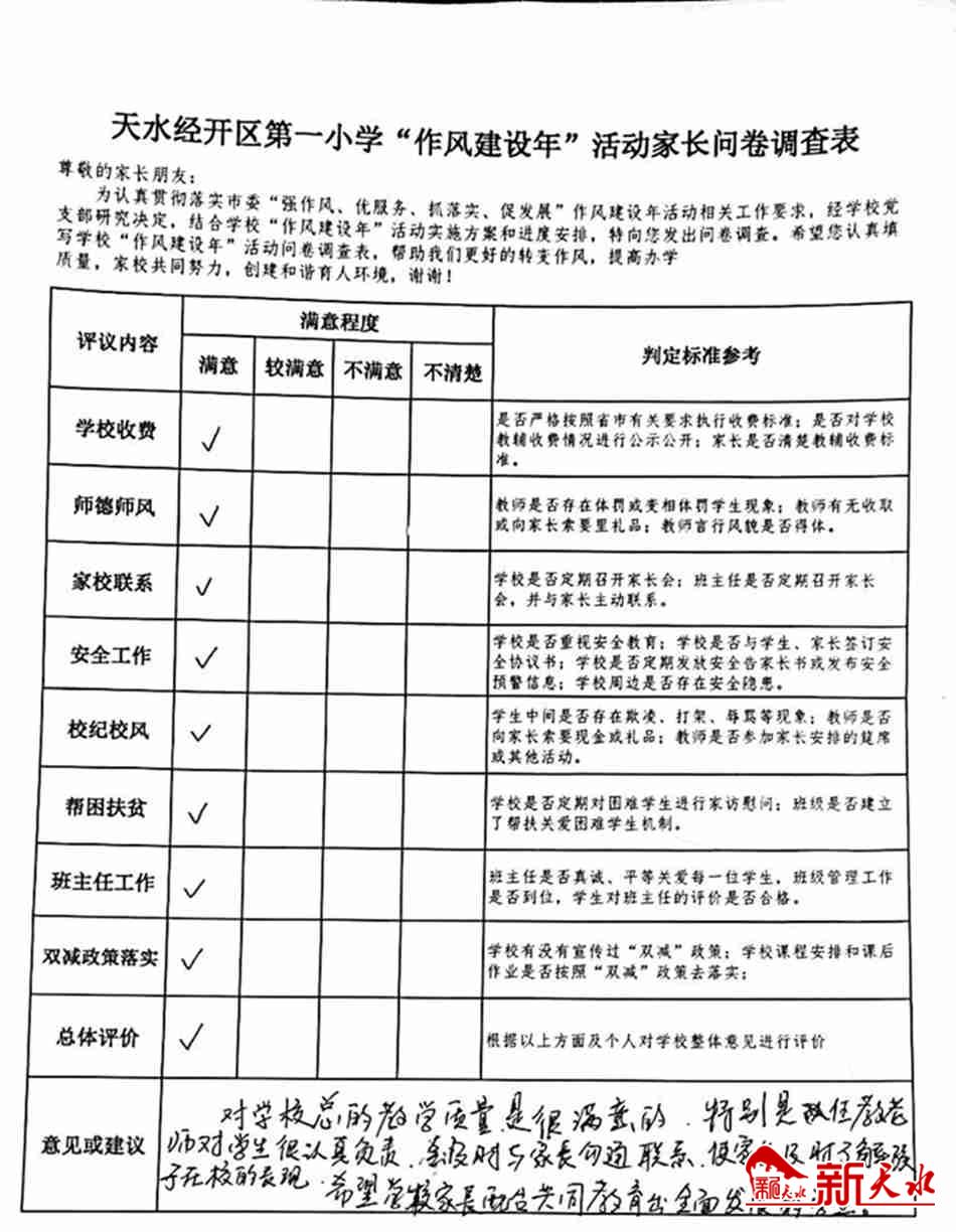 新天水讯 为深入推动学校“强作风、优服务、抓落实、促发展”作风建设年活动全面落实,准确掌握并了解家长诉求,按照经开区党工委有关“作风建设年”活动实施方案和进度要求,结合学校实际情况,近日,天水经开区第一小学开展了一次“作风建设年”活动家长问卷调查工作。