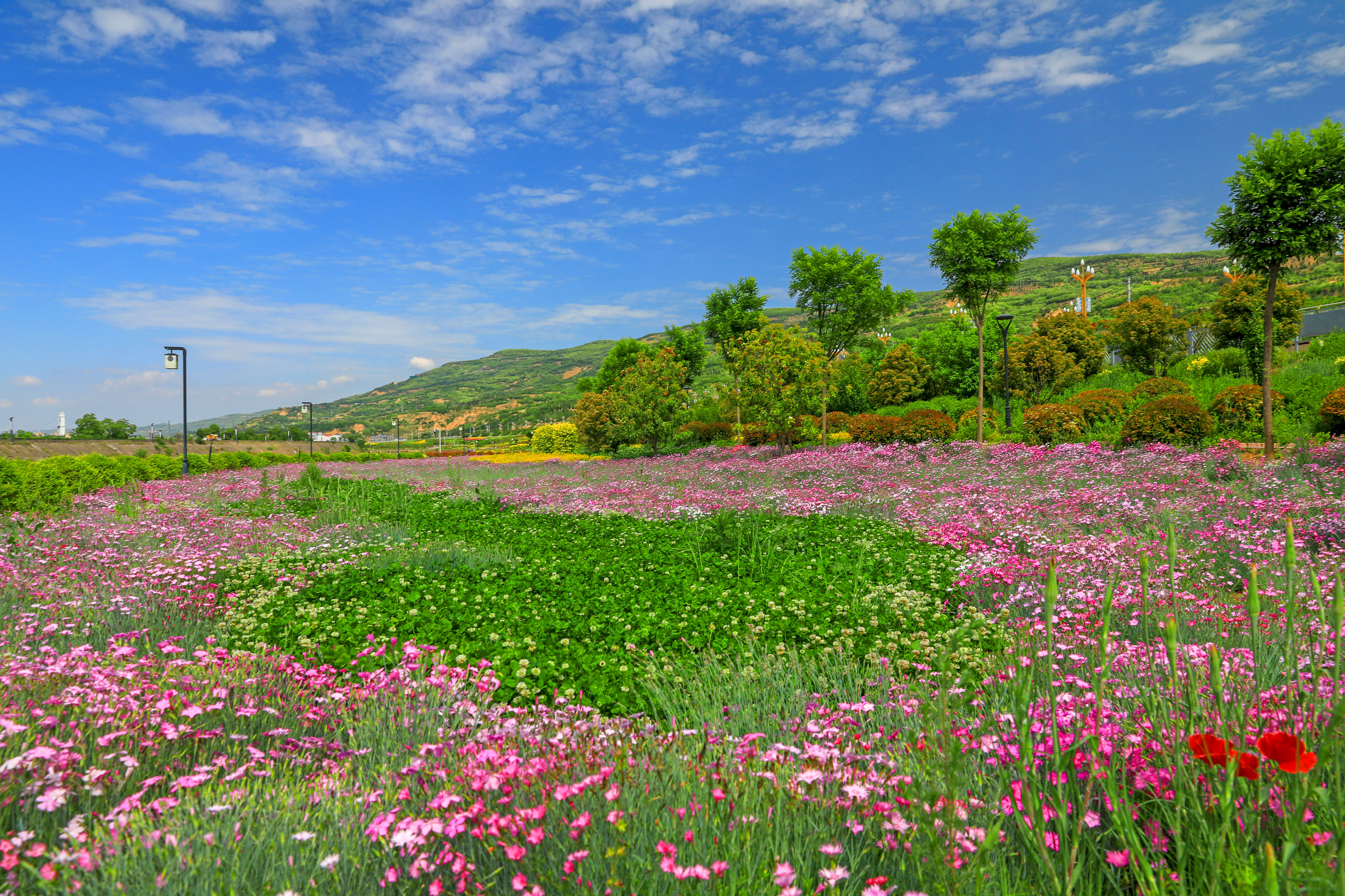 5月12日,天水市麦积区渭河风情线上的多种花卉竞相绽放,汇成一片花海,吸引了众多的游客和市民前来观赏和游玩。