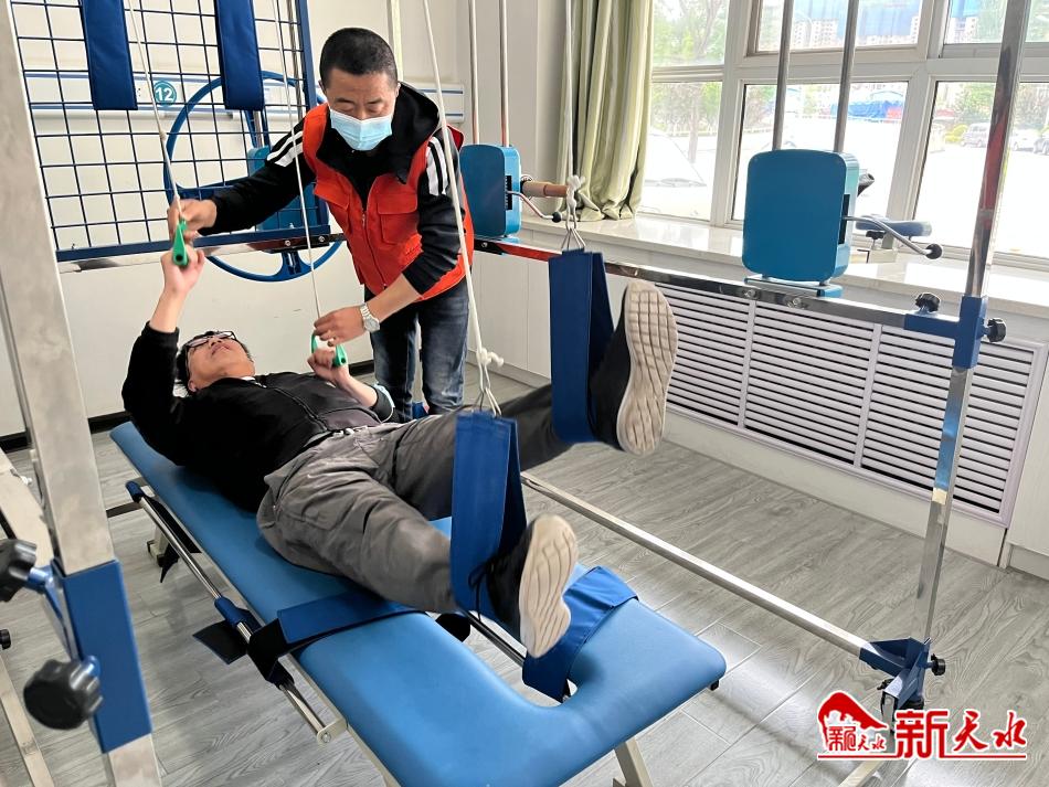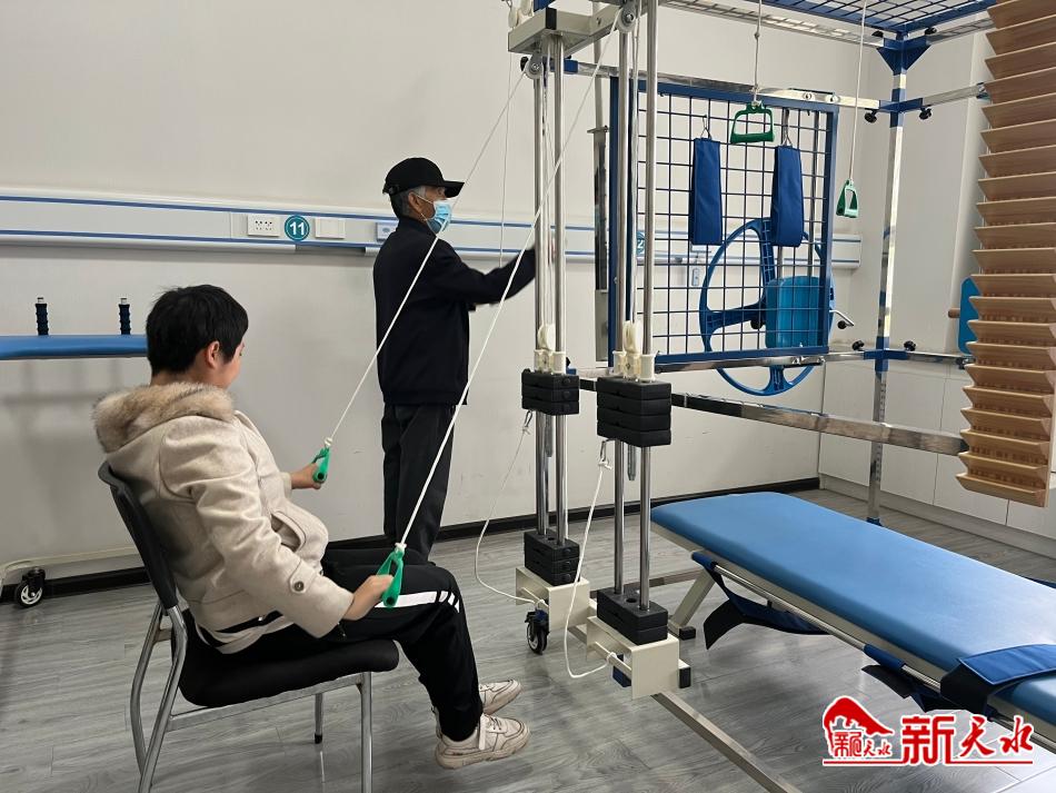 来到康复训练区,记者在综合训练器旁看到,一位着穿红马甲的工作人员正在辅助日间照料对象开展肢体康复训练中。“双手要握紧把手,要匀速用力……”