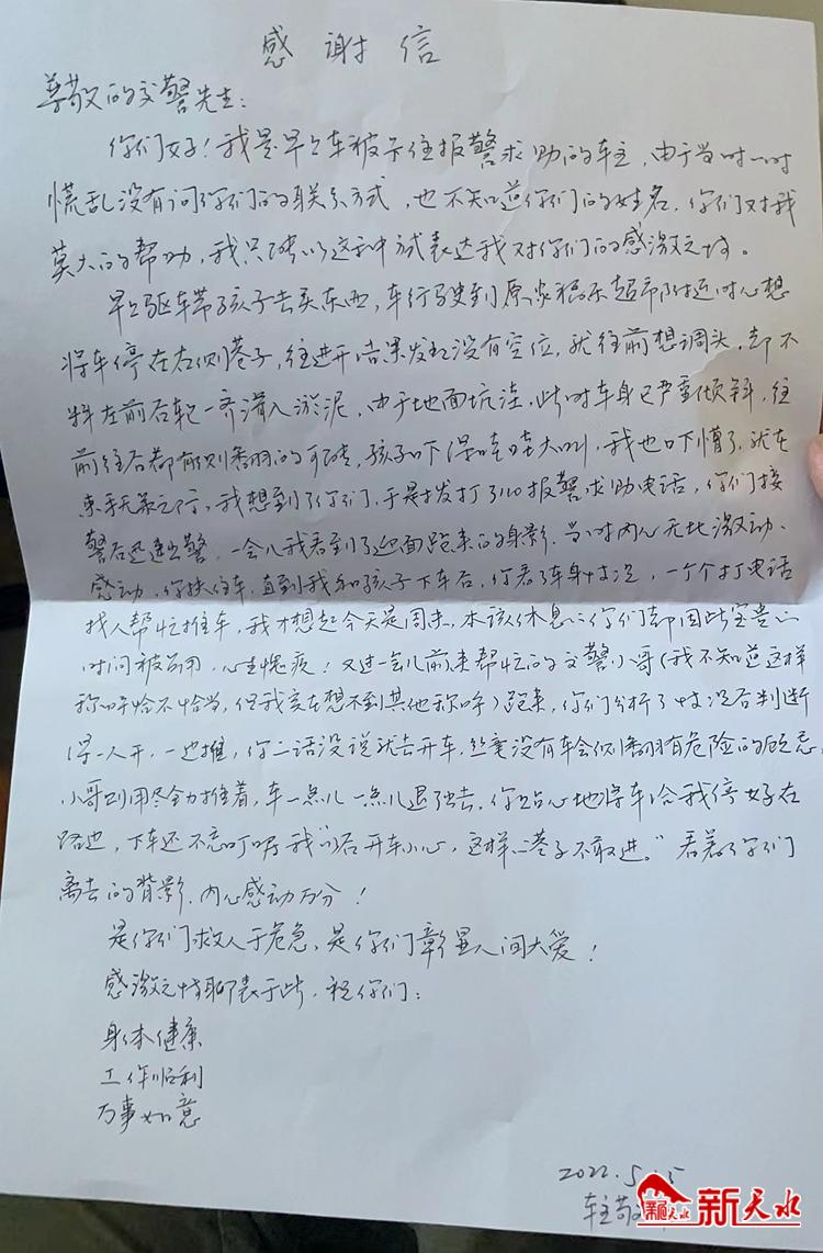 新天水讯【记者余碧波】“尊敬的交警先生:你们好!我是早上车被卡住报警的车主,由于当时慌乱没有问你们的联系方式,也不知道你们的姓名,你们的莫大帮助,我只能以这种方式表达感激之情……”5月15日,秦安县公安局交警大队事故中队收到一封手写的感谢信,信是一位受到交警帮助的群众送来的,她在信中写道:“是你们救人于危急,是你们彰显人间大爱。”
