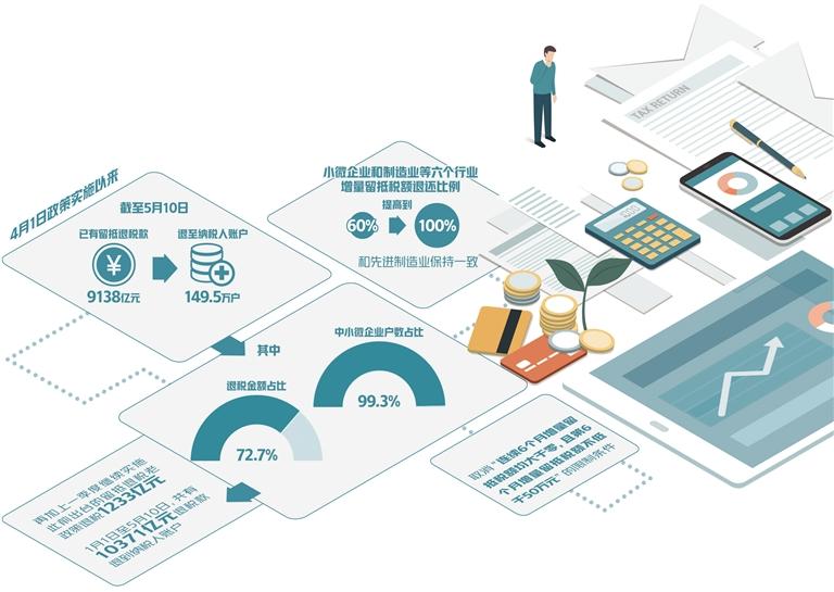 今年增值税留抵退税规模约1.5万亿元。4月1日政策实施以来,截至5月10日,已有9138亿元留抵退税款退至149.5万户纳税人账户。其中,中小微企业户数占比99.3%,退税金额占比72.7%,再加上一季度继续实施此前出台的留抵退税老政策退税1233亿元,1月1日至5月10日,共有10371亿元退税款退到纳税人账户,为企业纾困解难、提振市场主体信心发挥了重要作用。
