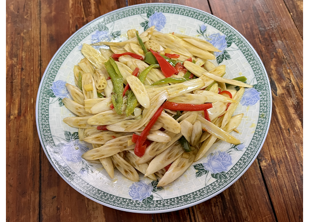 采收回来的藕尖至少要清洗三遍才能洗掉外面的泥浆,清洗干净的藕尖晶莹剔透,如白玉般光洁。新鲜的藕尖咬一口清脆爽口,还带着一股香甜,这就是大自然的绝美馈赠。藕尖的烹饪其实很简单,把油烧热,将鲜嫩的藕尖倒进锅里,再加上醋、红绿辣椒等,煸炒两分钟就可以起锅了。