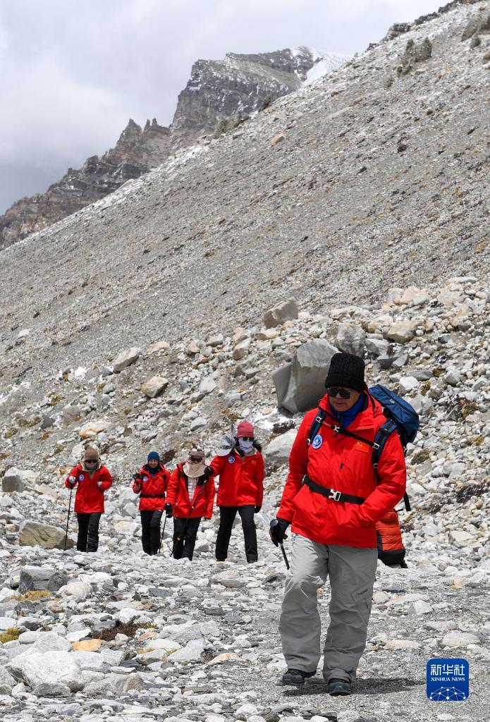 中国科学院院士、北京大学环境科学与工程学院院长朱彤(右一)和科研人员在珠峰登山大本营和绒布冰川间徒步穿梭(5月1日摄)。新华社记者 姜帆 摄