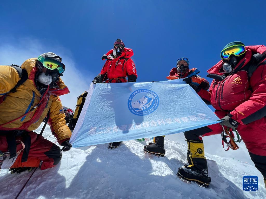 在珠穆朗玛峰峰顶,科考队员展示第二次青藏高原综合科学考察研究旗帜(5月4日摄)。新华社特约记者 索朗多吉 摄