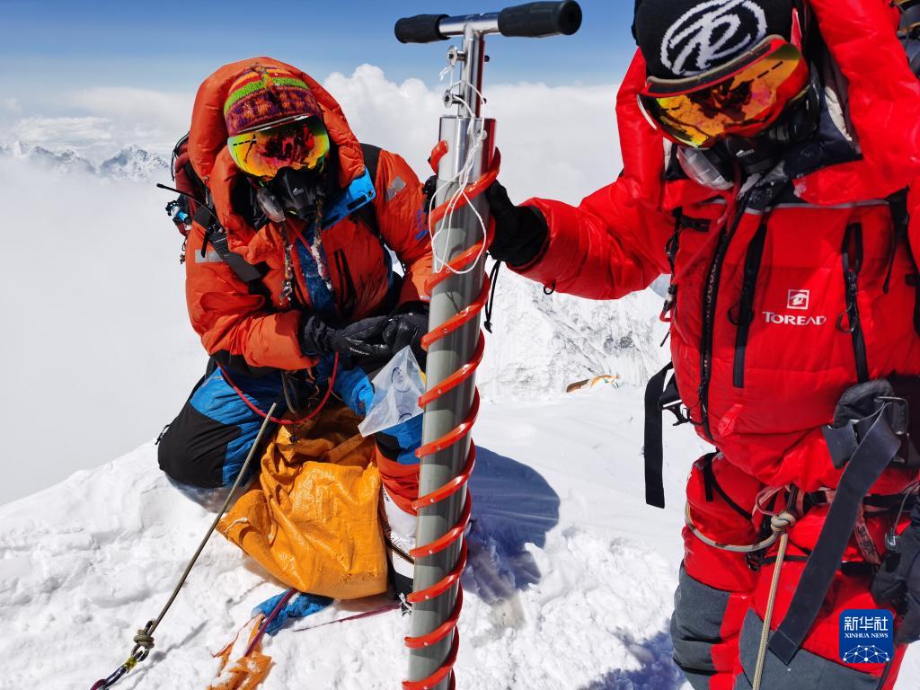 德庆欧珠(左)和队友在珠峰海拔8830米处架设世界海拔最高自动气象站(5月4日摄)。新华社特约记者 索朗多吉 摄