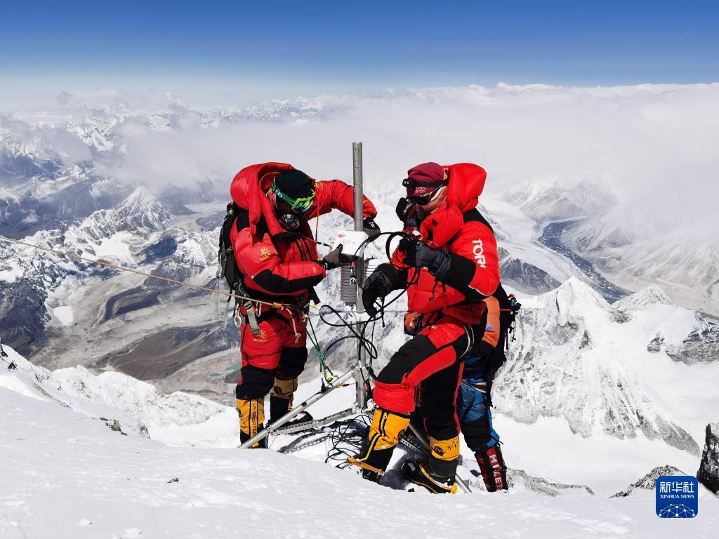5月4日,德庆欧珠带领的登顶小组科考队员,在珠峰海拔8830米处架设世界海拔最高自动气象站,建成珠峰梯度气象观测体系;在峰顶首次利用高精度雷达测量冰雪厚度,并采集了峰顶冰雪样品。