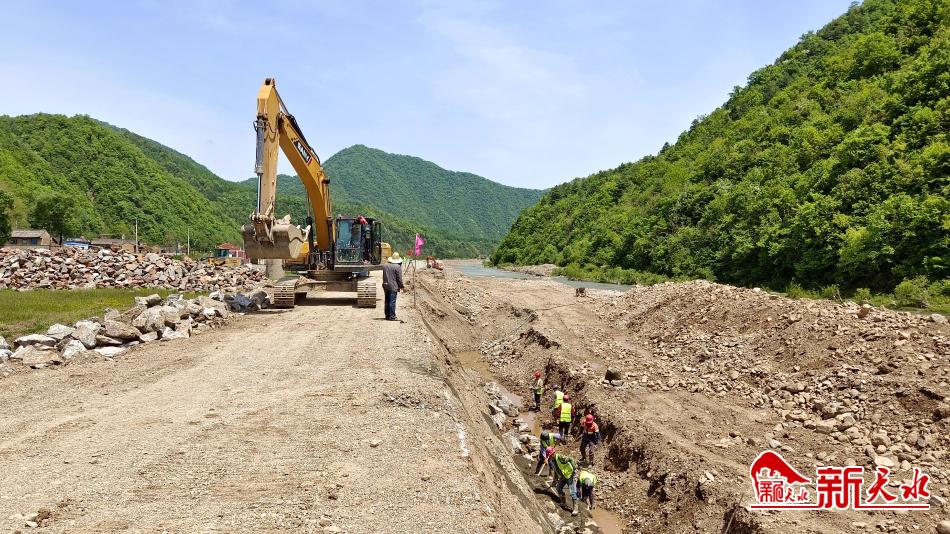 入夏,天水进入防汛期。5月18日,秦州区娘娘坝镇白家河流域的河水滚滚、蜿蜒曲折,沿着狭长的河谷奔涌向东,在娘娘坝镇沟门村与嘉陵江交汇,一路向东融汇于长江。备战防洪堤防工程的建设现场,施工人员正在河床上浆砌石基,挖掘机穿梭开掘河道,吊机运转大型石块,现场机器轰鸣、人声鼎沸,一片如火如荼的热闹景象。