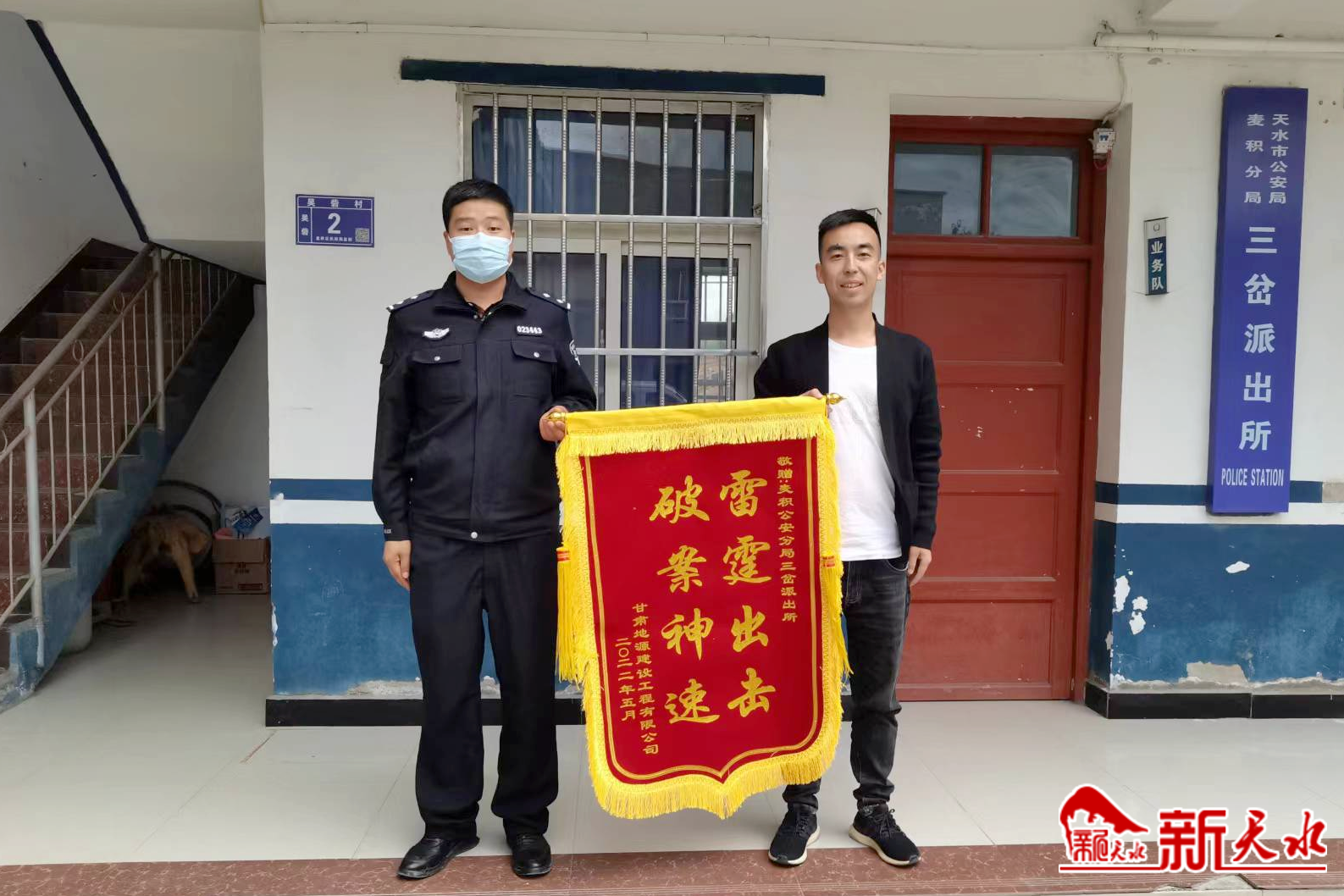 新天水讯【记者王晓华】“太感谢你们了,替我们公司挽回了损失。”5月16日,甘肃地源建设工程有限公司负责人专程来到三岔派出所,将一面写有“雷霆出击 破案神速”的锦旗送到民警手中,对民警忠诚奉献、诚心为民的优良作风赞扬不已。