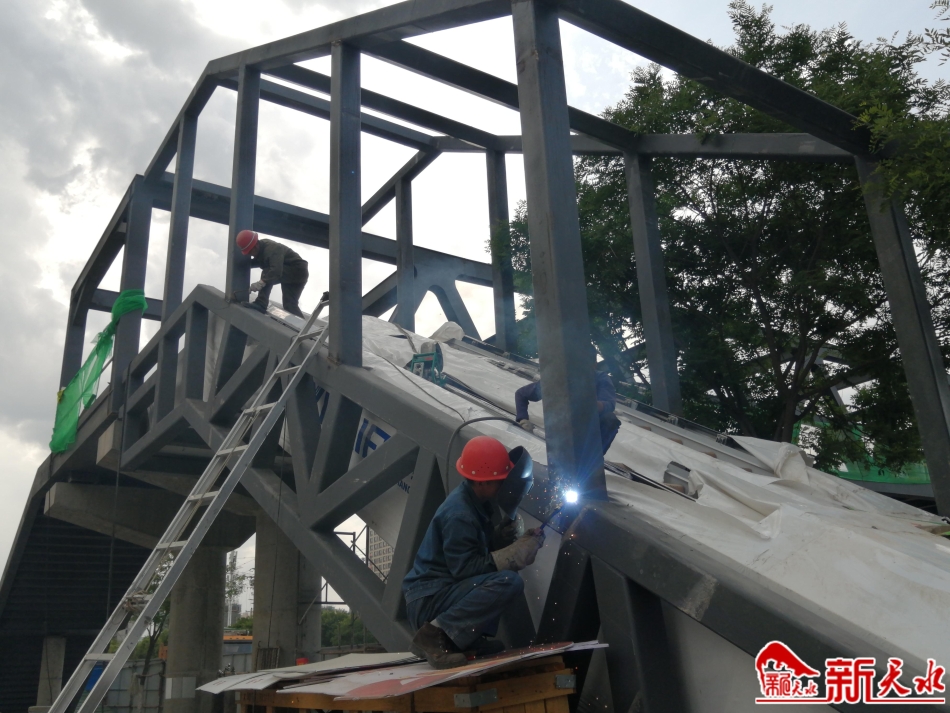 5月20日,记者在秦州区赤峪路华天电子产业园片区人行天桥施工现场看到,施工人员正在对天桥南侧自动扶梯上侧的钢结构进行收尾焊接和涂漆。