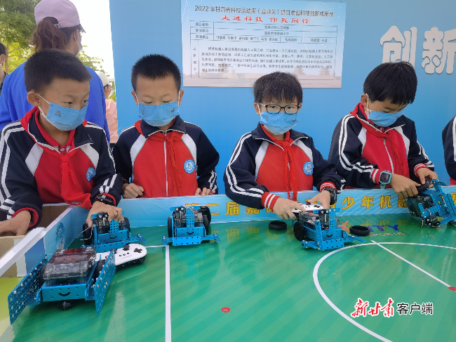 走进科技,你我同行。在另一个展区,嘉峪关市南湖小学发明的插件机器人足球赛吸引了大家的眼球,精彩的机器人足球比赛,引来阵阵掌声。