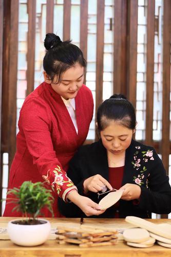 △郭娟(左)教人制作麻鞋
