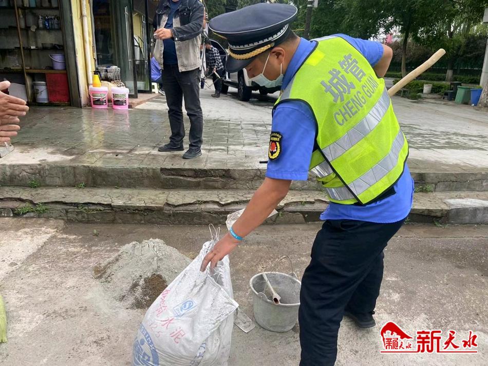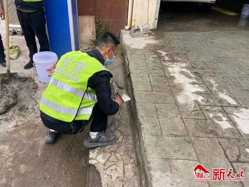藉河南路迎宾桥周边台阶破损与塌陷,阻碍了市民正常通行也存在较大的安全隐患,而且破损的台阶也影响市容市貌的美观,该中队队员在告知周围群众绕道通行的同时,立即着手准备工具,对此处破损台阶进行修补。中队队员以精、细、美为原则亲自上手,在抬水泥、和水泥、修复、抹平等一系列操作后,破损的台阶恢复整洁面貌,在消除安全隐患的同时提升市容市貌。