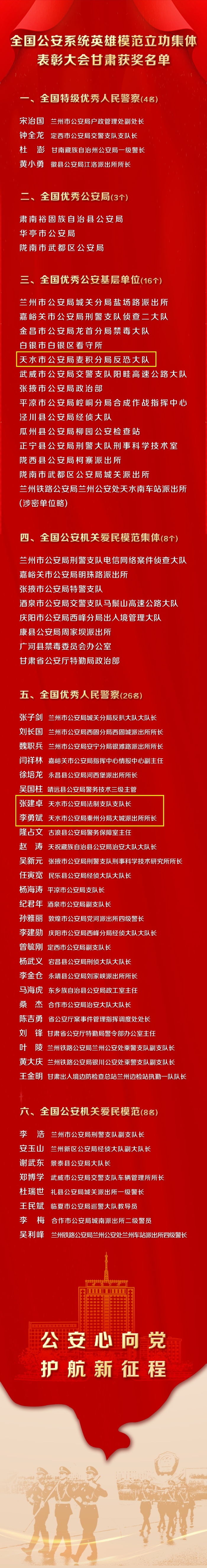 在此次表彰中,天水市公安局麦积分局反恐大队被评为全国优秀公安基层单位;天水市公安局法制支队支队长张建卓、天水市公安局秦州分局大城派出所所长李勇斌被评为全国优秀人民警察。