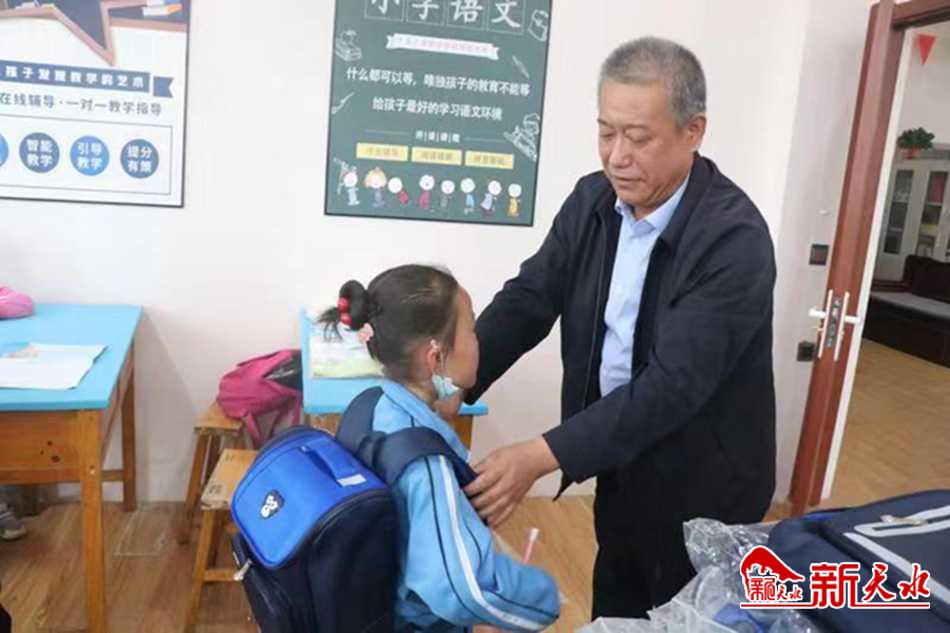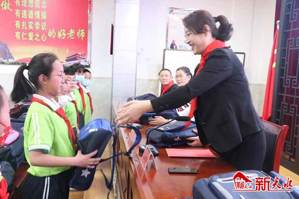 慰问组一行先后深入甘谷县大像山镇柳湖小学、甘谷县翔隆强制衣厂职工子女托管班,为学生们送上书包、文具盒、跳绳、红领巾等爱心礼包,并提前送上节日的问候和美好的祝福。