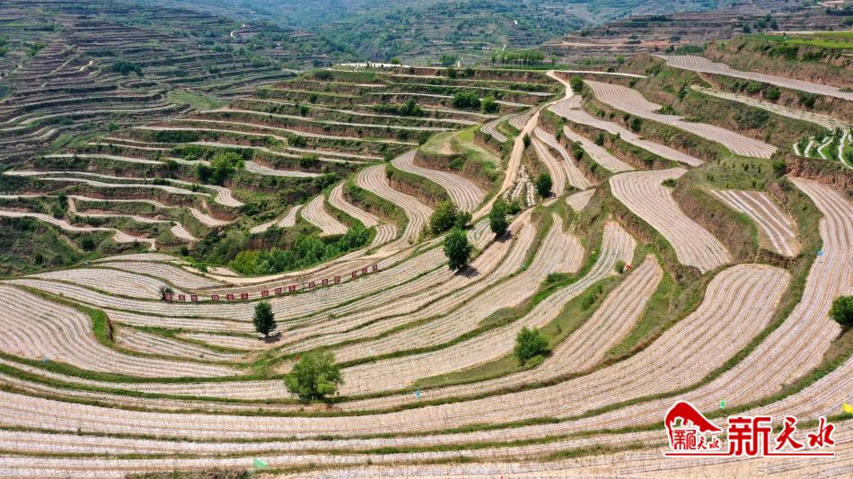 秦安县中山镇东寨流域千亩高山架豆种植示范基地连片梯田上,一行行豆角架,整整齐齐排列着。