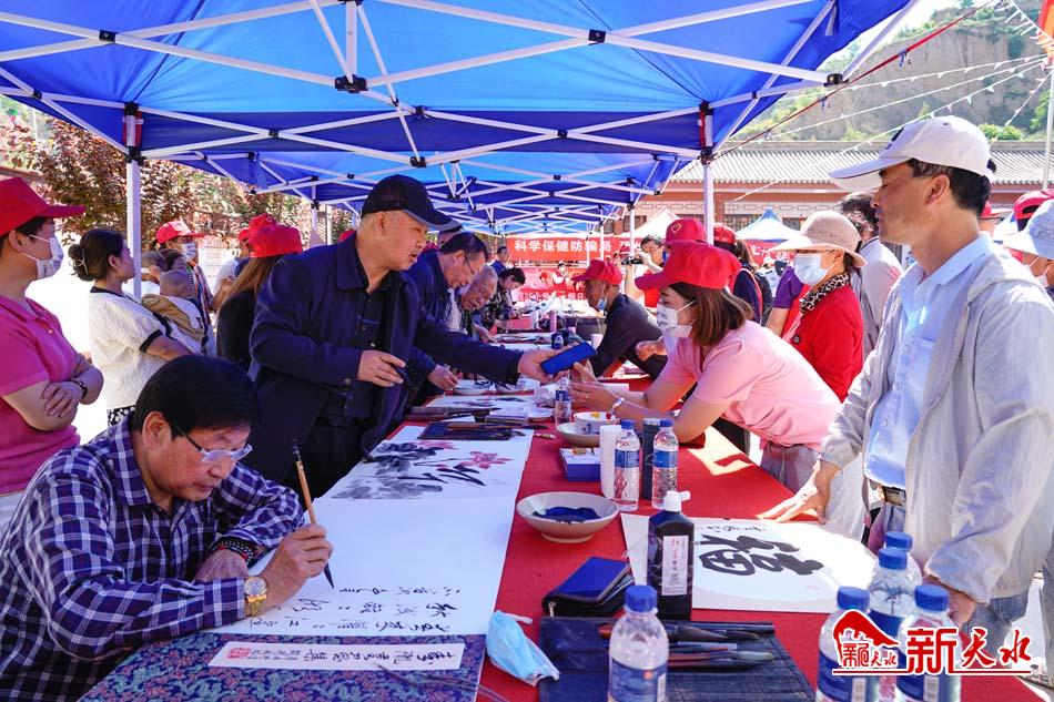在活动现场,公安、卫生等各相关单位设立了服务点,为群众捐赠了药品和图书,普及科学知识,提供咨询服务等;理论宣讲志愿者为村民进行开展党的十九届六中全会精神及党的惠民政策宣讲;县农村电影公益放映工作站为村民播放了电影,让广大村民在家门口就能看到电影;书画名家现场挥笔泼墨,秦腔、秦安小曲、蜡花舞等传统节目轮番上阵,安伏教育园区的师生们精心编排了中华经典诵读活动,为现场群众送上了一场丰盛的文艺“大餐”。