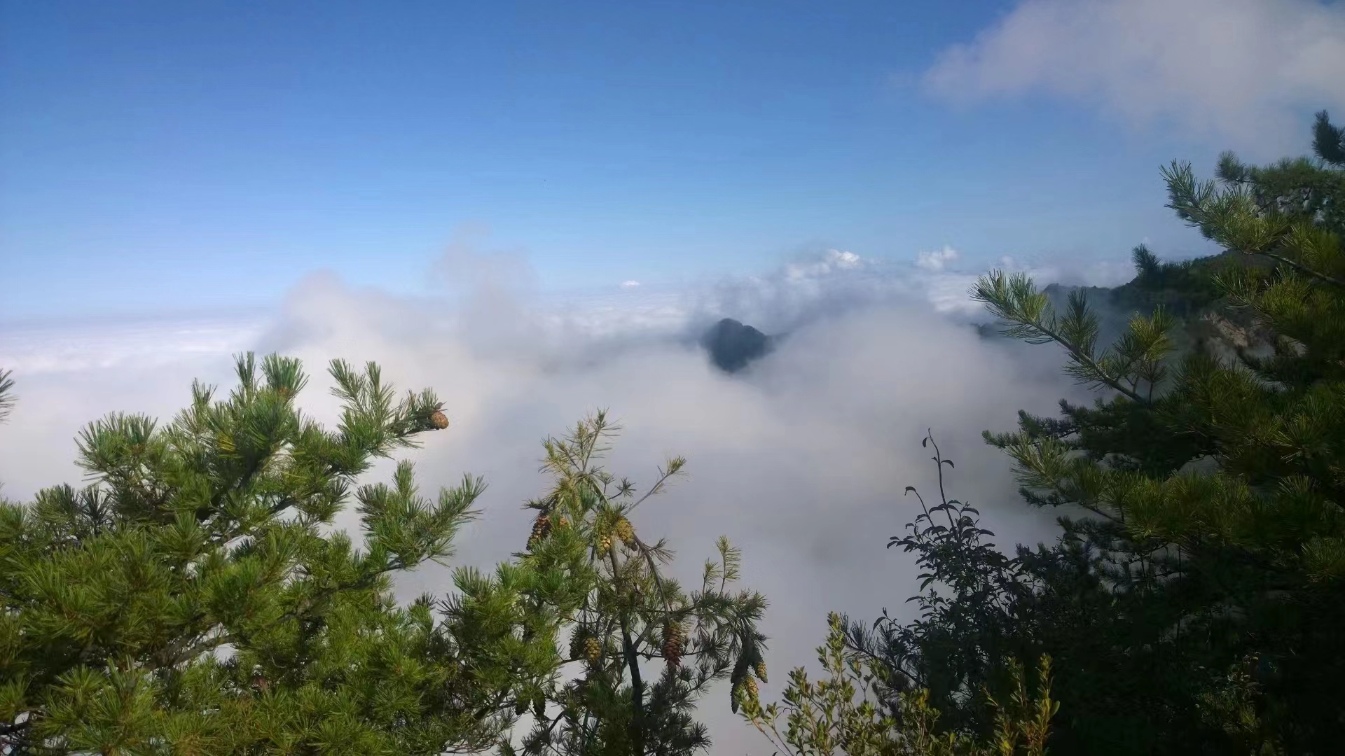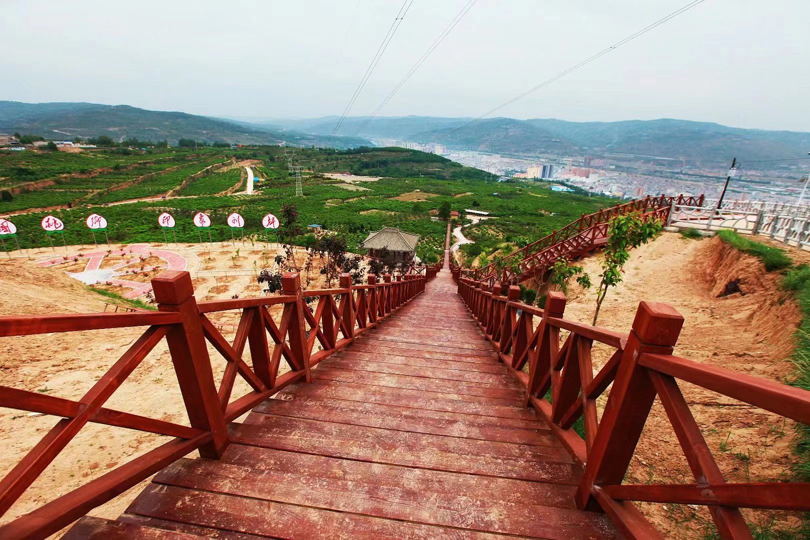 到秦安,出县城,自东上山去刘坪万亩桃园,观景台上,“白云回望合,青霭入看无”。