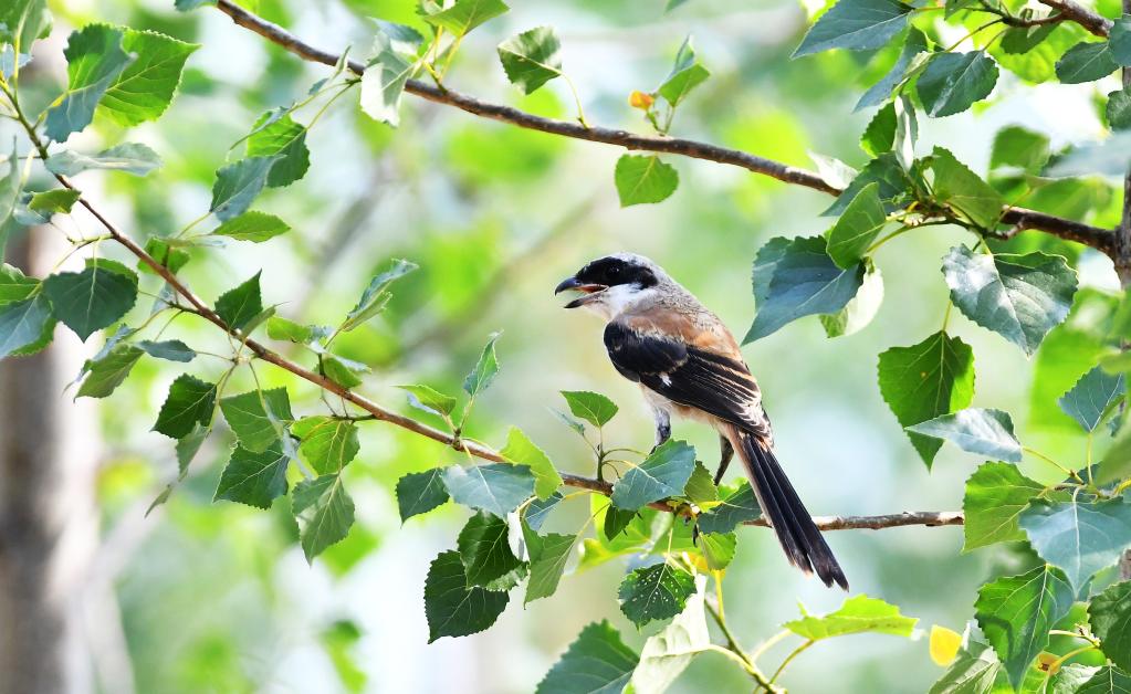 5月29日,在山东省滕州市西岗镇半阁村,一只伯劳鸟在枝头鸣叫。新华社发(李志军摄)