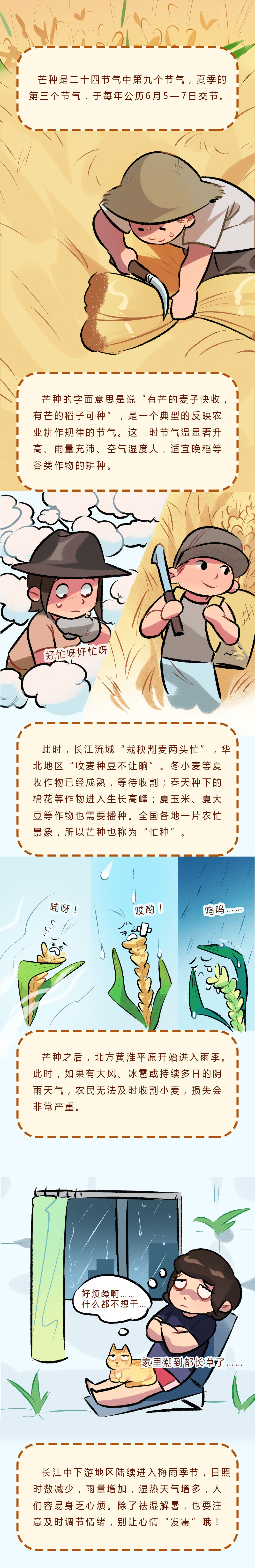 “芒”指麦类等有芒作物成熟;“种”指谷黍类作物的播种。“芒种”又谐音“忙种”。