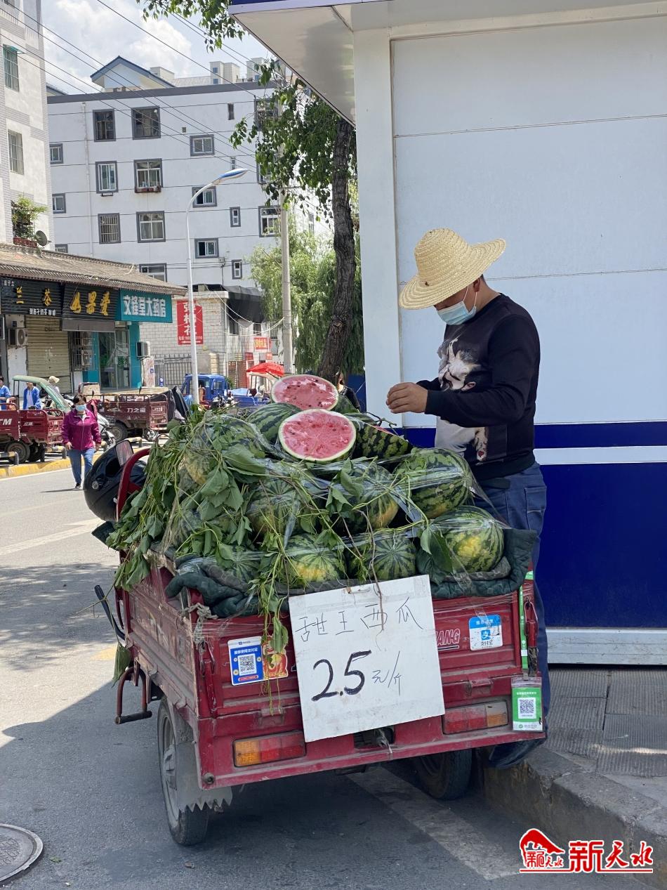 “现在我们店里有4种西瓜种类,在售的这种冰糖麒麟瓜在5月初时卖到将近6元一斤,现在3.5元一斤,相当于打了对折。此外,店里的黄肉西瓜‘特小凤’和甜王西瓜的价格都从每斤5元降到了2.5元,同样便宜了一半。”在秦州区光明巷的一家水果连锁店里,店员正给一位顾客热情介绍着,最后这位顾客花了15元买一个甜王西瓜。