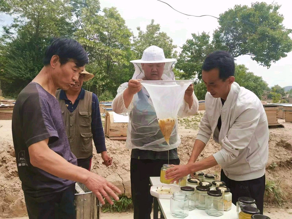 端午前夕,海拔1900米的武山县山丹镇明山村的一个院落内,由驻村帮扶队员、村干部、群众组成的养蜂团队正在打蜜。随着蜂蜜装瓶密封好贴上商标,在蜜蜂“嗡嗡嗡”声的喝彩下,明山村今年的“甜蜜”事业大功告成。 为了发展壮大村集体经济,让群众有致富产业,明山村村干部、驻村帮扶工作队瞄准了发展养蜂产业。“我们目前养了80多箱蜜蜂,主要目的就是强村富民,带动明山村群众增加收入,提升乡村振兴能力。”明山村驻村帮扶工作队第一书记张芳明说。