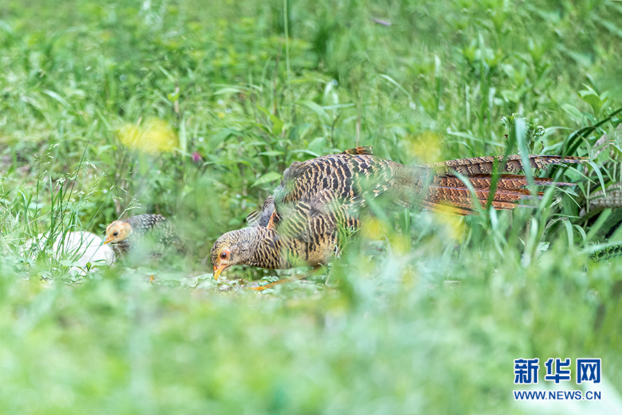 红腹锦鸡是国家二级保护动物,被称为鸟中“小凤凰”,列入《中国濒危动物红皮书》和《世界自然保护联盟》2016年濒危物种红色名录。近年来,重庆市南川区加大野生动物保护力度,栖息在金佛山国家自然保护区的红腹锦鸡逐年增多。初夏时节,红腹锦鸡成鸟带着新出生的小宝宝在金佛山林间玩耍、觅食,小宝宝萌态十足的样儿可爱至极,十分惹人喜爱。新华网发(瞿明斌 摄)