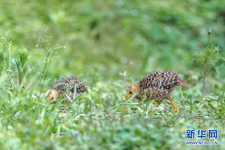 在重庆市南川区金佛山国家自然保护区,两只红腹锦鸡小宝宝在寻找食物。新华网发(瞿明斌 摄)