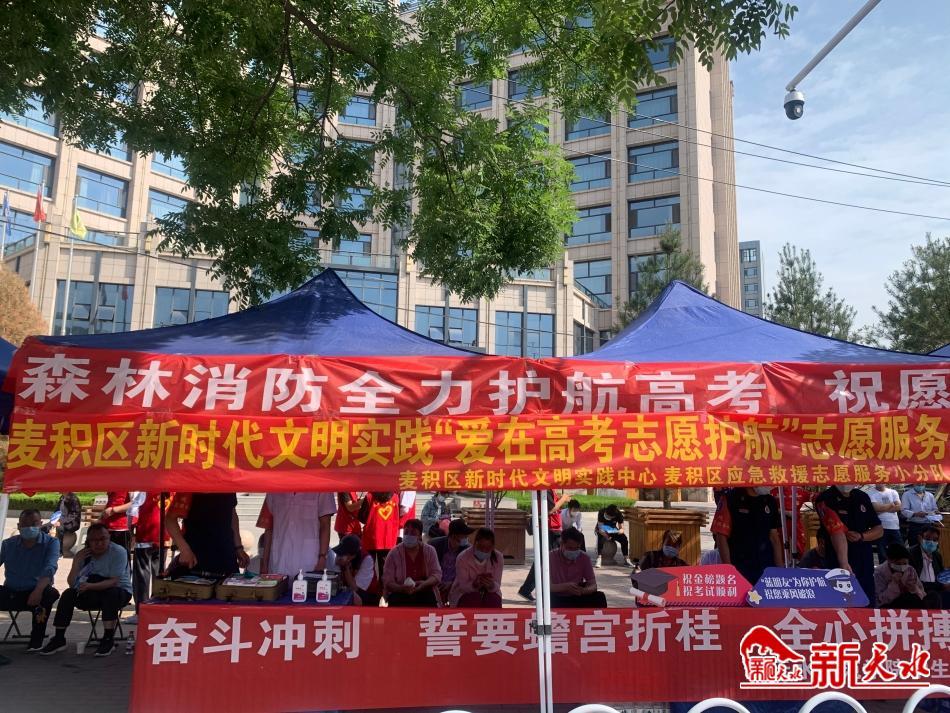 麦积区新时代文明实践中心在天水市二中、九中等考点设立了爱心服务站,从早上八点到下午五点半,为莘莘学子和陪考的家长免费提供矿泉水、医用外科口罩、防暑清凉物品等,并搭建避暑凉亭为家长提供休息的地方,在考点周边交通控制点,志愿者协助交警进行文明交通引导,维持道路通行秩序。引导广大运输经营者和驾驶员在考点周边道路临时限行路段绕道行驶,杜绝喇叭鸣响、乱停乱放等现象发生。