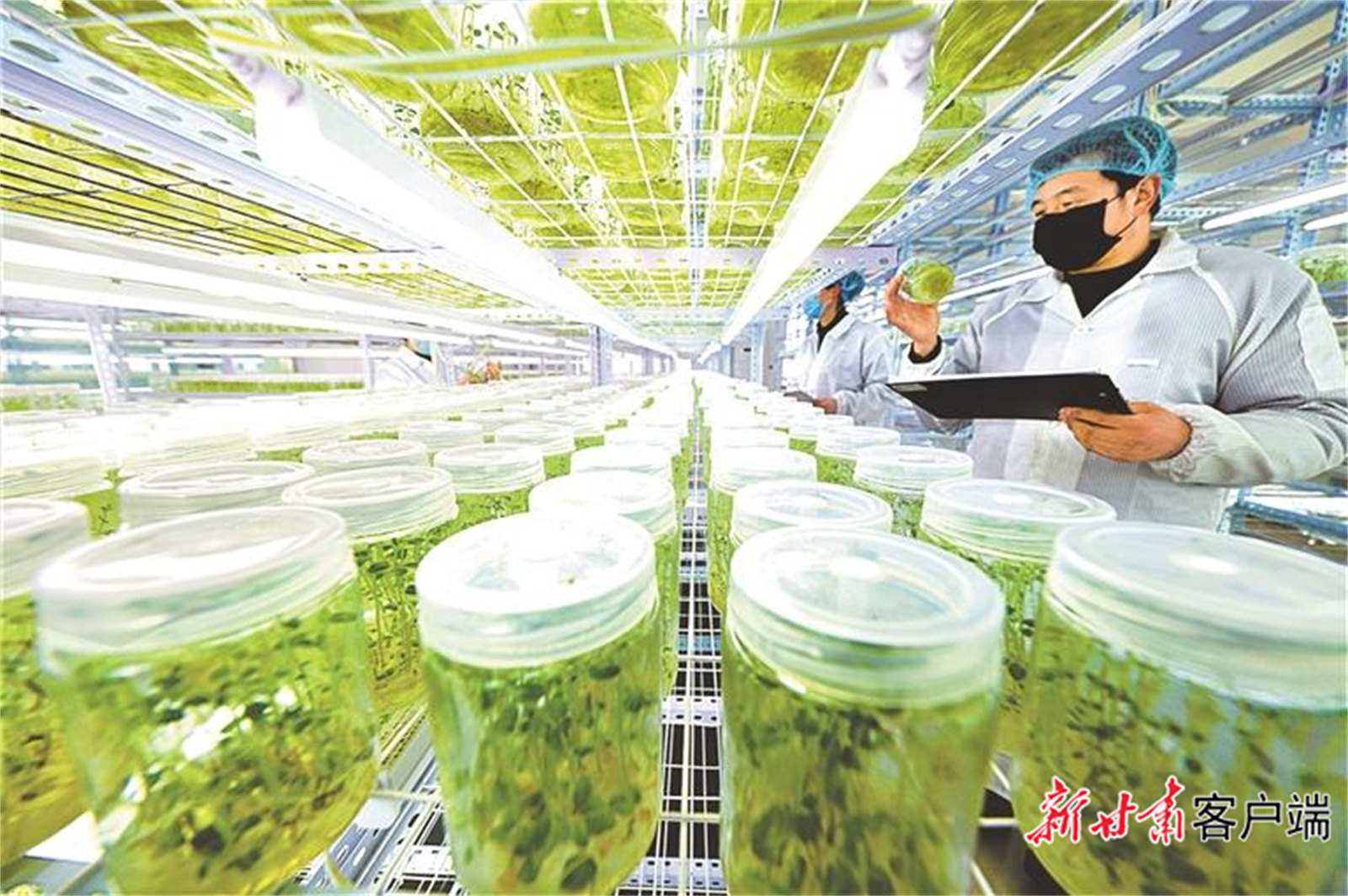 甘肃祥和种业有限责任公司育苗组培室内,工人们正在查看马铃薯脱毒苗长势。新甘肃·甘肃日报通讯员 赵 琳
