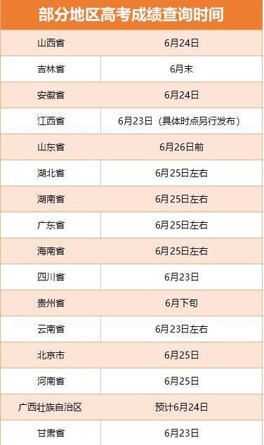 目前,多地已公布了今年高考的成绩查询时间,时间段主要集中在6月23日至26日之间。