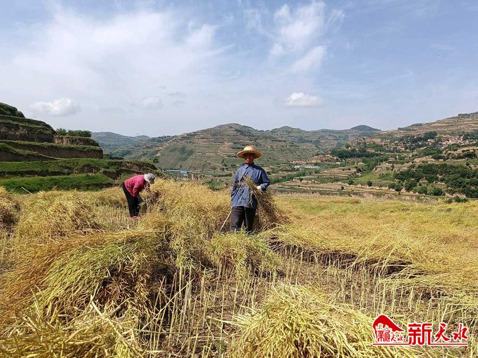 新天水讯【通讯员 石建云 冯杰】秦安县中山镇6000余亩油菜籽喜获丰收,农民群众正抢抓天晴少雨的有利时机开镰收割,预计6月20日前全面完成收割任务。
