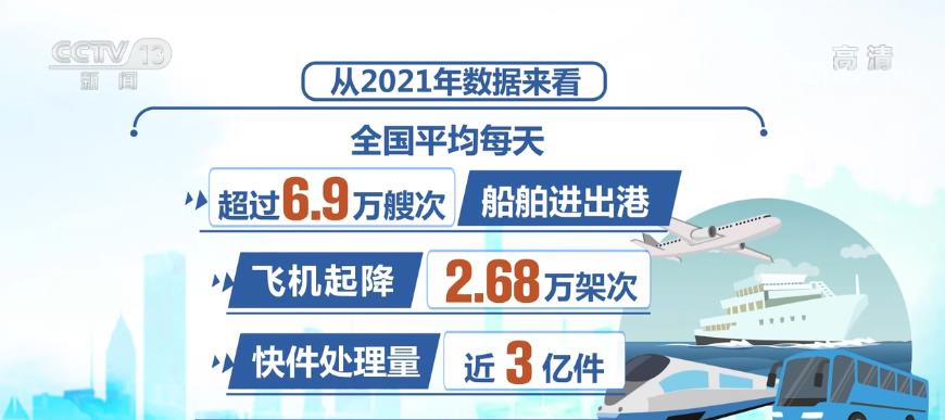 从2021年数据来看,全国平均每天有超过6.9万艘次船舶进出港,飞机起降2.68万架次,快件处理量近3亿件。高峰时,平均每天铁路开行旅客列车超过1万列,高速公路车流量超过6000万辆次,“人享其行、物畅其流”初步实现,交通运输成为人民群众获得感最强的领域之一。