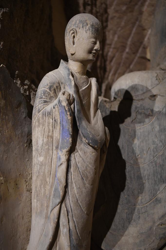 ▲这是有着“东方微笑”之称的麦积山石窟第133窟第9号龛内的小沙弥造像(6月9日摄)。新华社记者陈斌摄