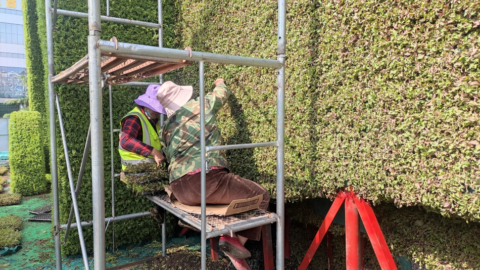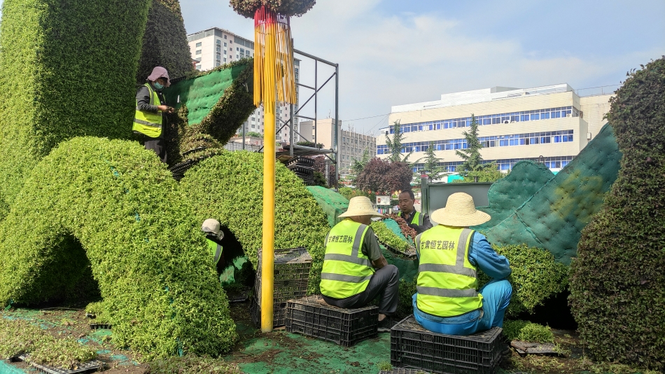 6月10日,工人正在龙城广场搭建绿雕。为了喜迎节会,秦州区住建部门连日来在龙城广场、大众路中段等地段,搭建生态装饰绿雕,营造喜庆氛围,美化城市。