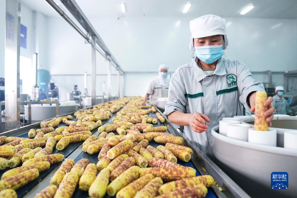 工人在吉林省农嫂食品有限公司生产车间内加工鲜食玉米(6月6日摄)。新华社记者 许畅 摄