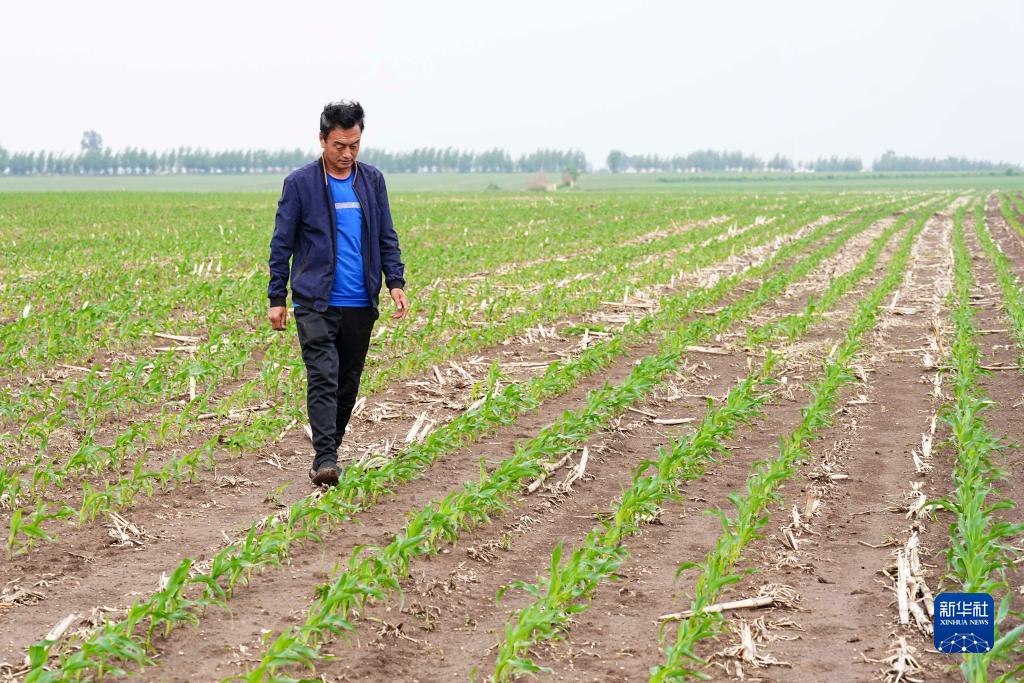 吉林省公主岭市朝阳坡镇东兴村种粮大户李振军行走在田野间观察玉米长势(6月6日摄)。新华社记者 许畅 摄