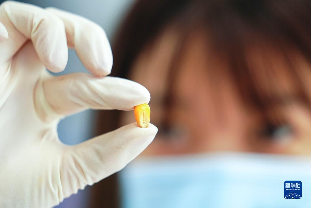 在吉林省宏泽现代农业有限公司实验室内,科研人员展示培育的玉米种子(6月7日摄)。新华社记者 许畅 摄