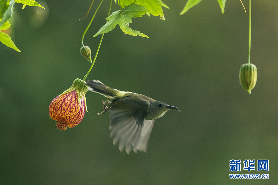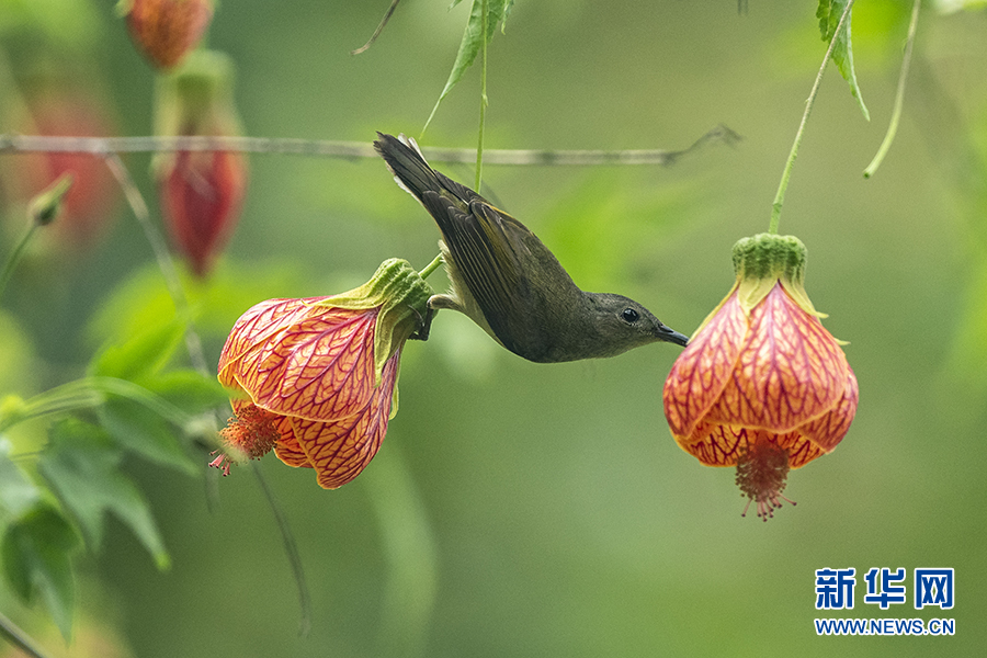 蓝喉太阳鸟雌鸟在吸食花蜜。新华网发(朱云平 摄)
