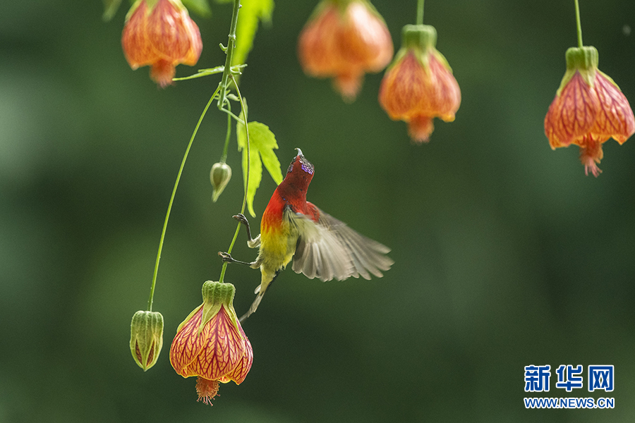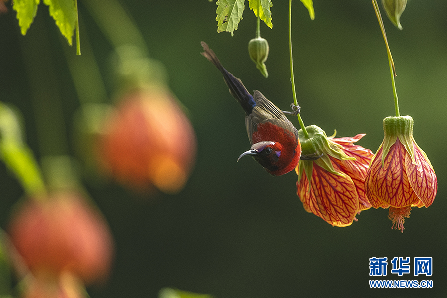 蓝喉太阳鸟雄鸟在灯笼花丛中飞舞。新华网发(朱云平 摄)