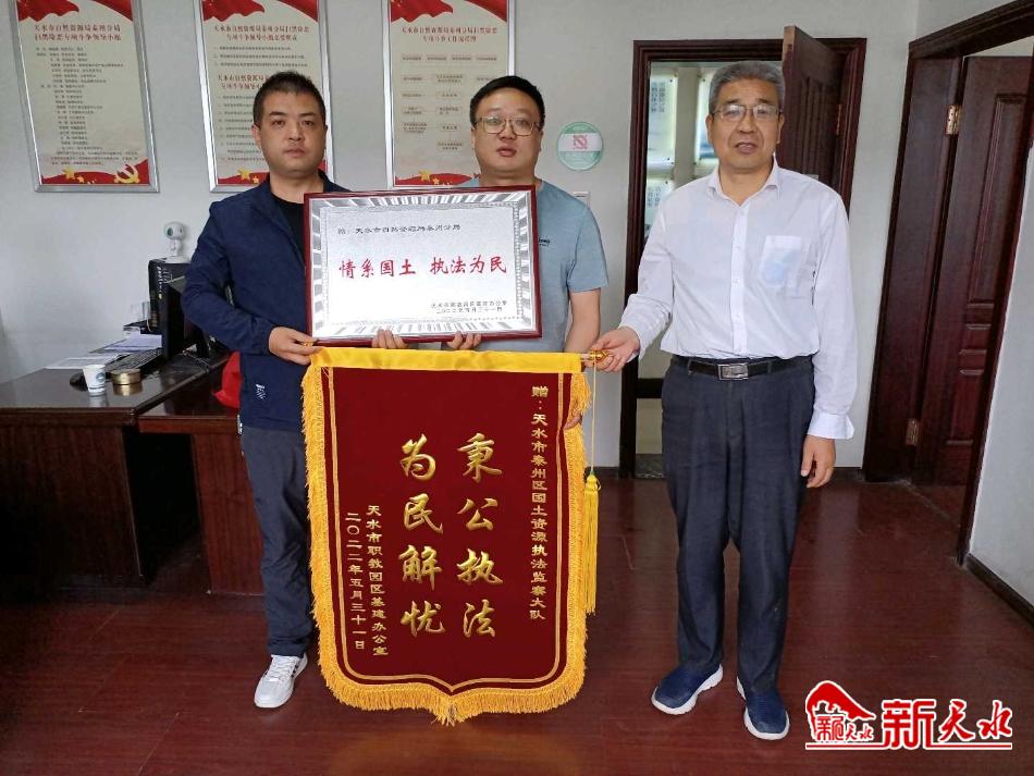 6月2日,天水市职教园区基建办公室向天水市自然资源局秦州分局赠送了“秉公执法,为民服务”的锦旗和“情系国土,执法为民”的牌匾,以感谢该局长期以来对他们提供的优质服务和帮助。